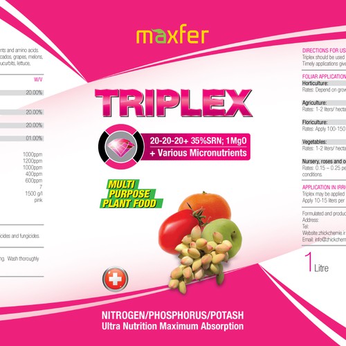 Create a simple and attractive label for liquid fertilizer | Product ... - A simple and attractive label with an unique format that our customers know us with the format - We have more than 20 products, which needs to be mentioned on the label - Our package is a white one liter round bottle - The label should contain 4 different fruits including tomato, orange, apple and pistachio - The size of label should be 15x28 cm (height x width) - We want to use a diamond ...