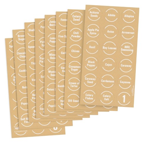 20 Best Spice Jars Labels In 2022: Reviews & Buying Guide Each package comes with 144 alphabetized, large white-labeled spice labels. This includes 128 most common spices and numbers 1-8 for those more creative cooks who want something specific but not too confusing. The chalkboard vinyl material is reusable and erasable - change the labels as many times as you like with no fuss.